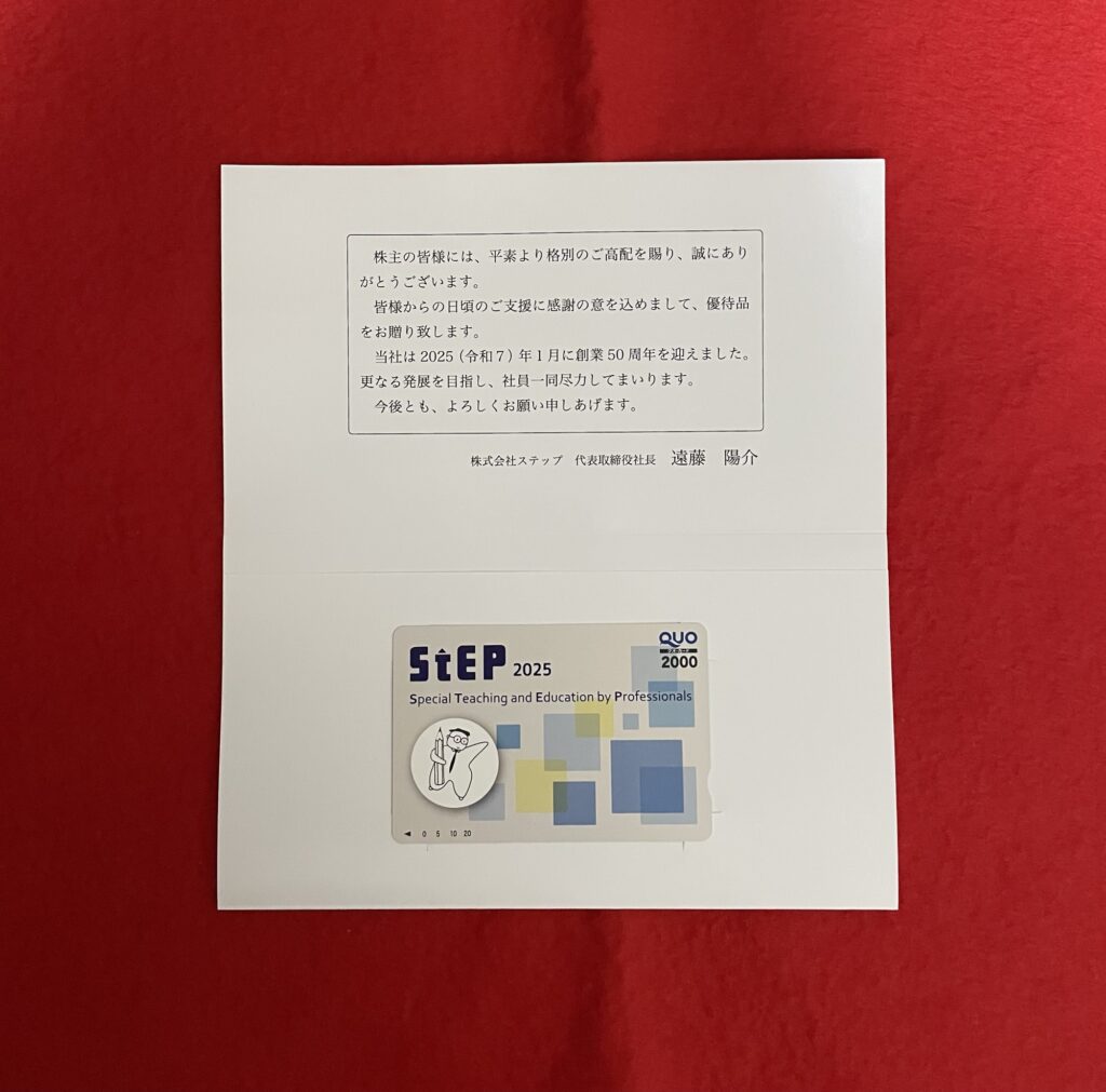 証券コード【9795】のステップからQUOカード(2,000円)が到着いたしました。