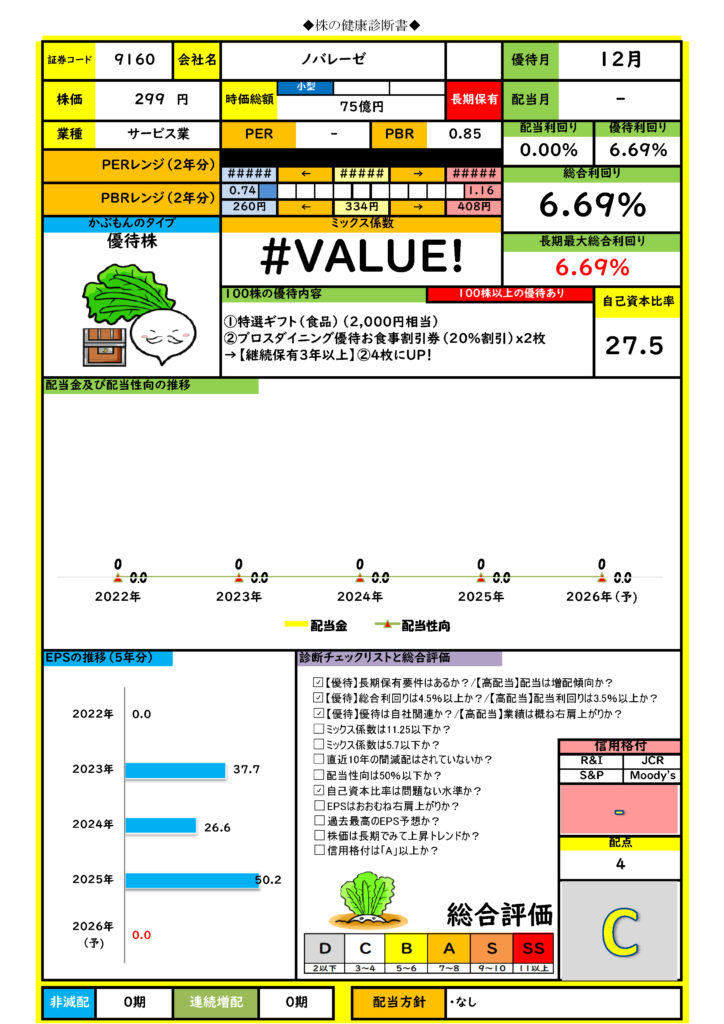 優待利回りは6.69%と高利回りですが配当はありません。