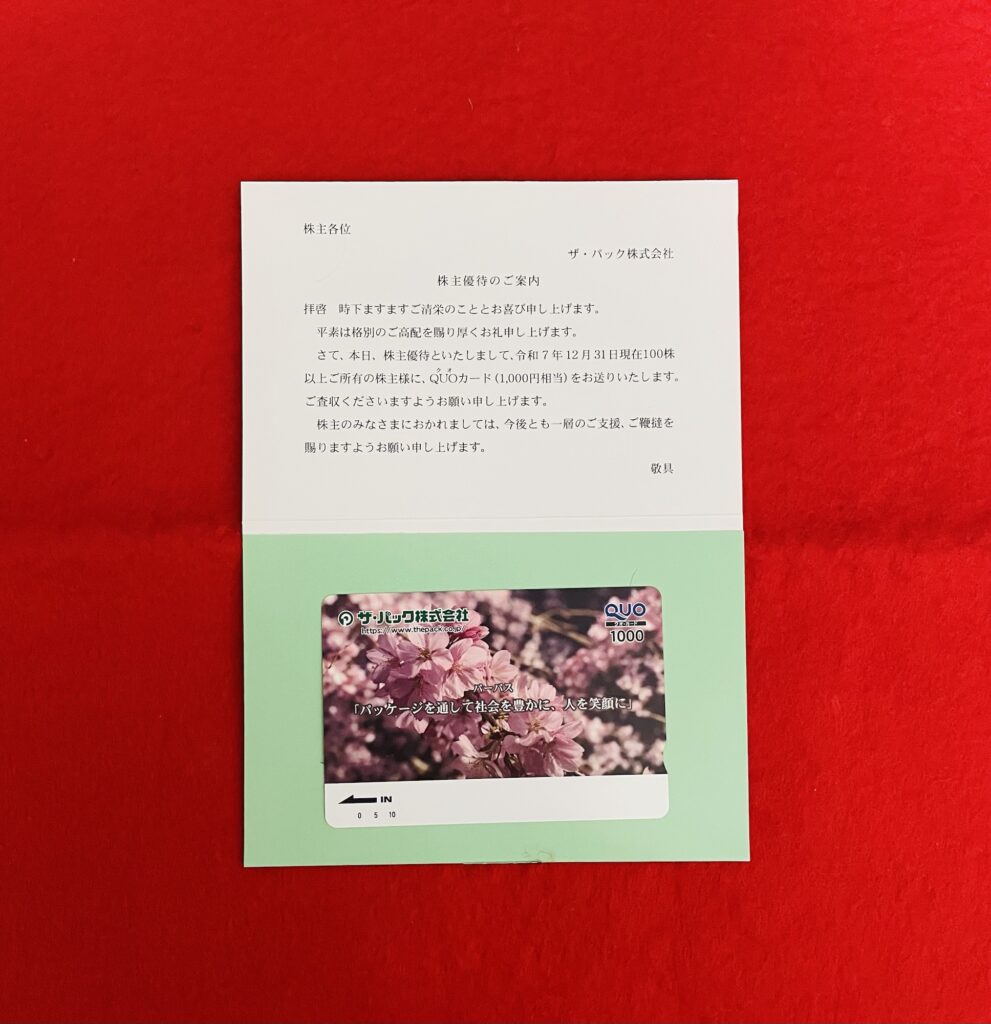 証券コード【3950】のザ・パックから「QUOカード(1,000円相当)」が到着いたしました。